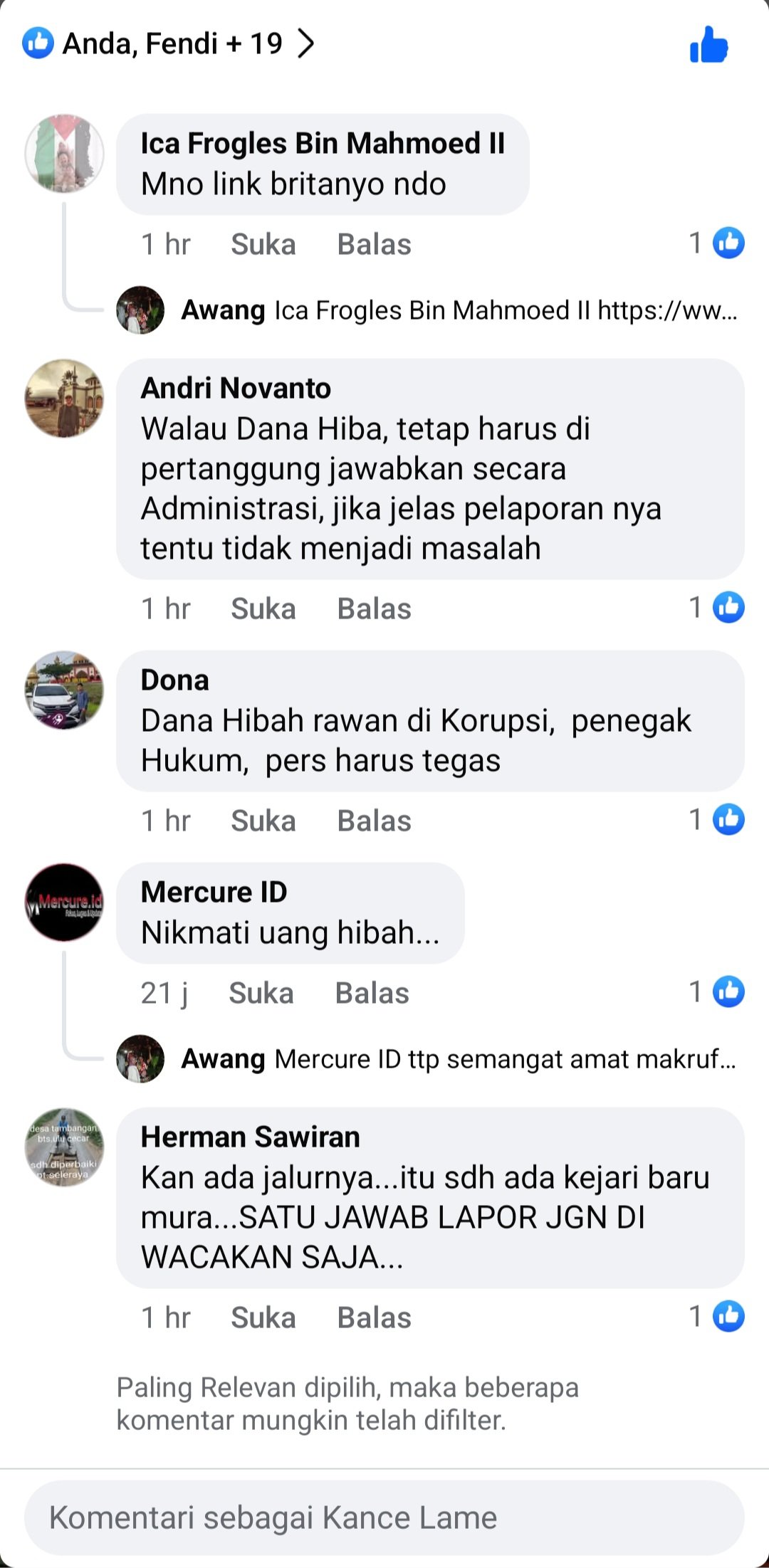 Komentar dari akun FB Andri Novanto : “Walau Dana Hiba, tetap harus di pertanggung jawabkan secara Administrasi, jika jelas pelaporan nya tentu tidak menjadi masalah.”