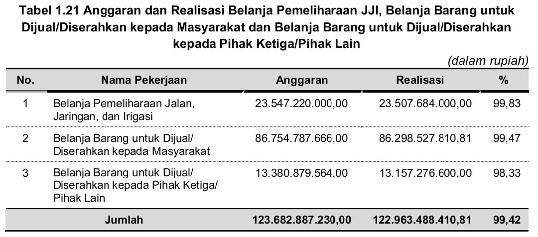 Di antara realisasi tersebut merupakan realisasi untuk Belanja Pemeliharaan JJI, Belanja Barang untuk Dijual/Diserahkan kepada Masyarakat dan Belanja Barang untuk Dijual/Diserahkan kepada Pihak Ketiga/Pihak Lain sesuai tabel berikut.