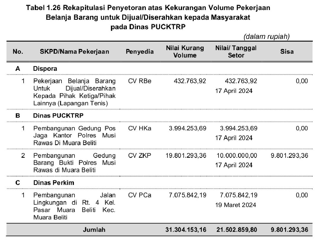 Berdasarkan reviu dokumen dan pemeriksaan fisik secara uji petik atas empat paket pekerjaan yang dilaksanakan bersama PPTK, Penyedia Jasa, Pengawas SKPD, dan Konsultan Pengawas, serta didampingi oleh Inspektorat Daerah Kabupaten Musi Rawas diketahui terdapat kelebihan pembayaran akibat kekurangan volume pekerjaan sebesar Rp31.304.153,16 atas empat pekerjaan.