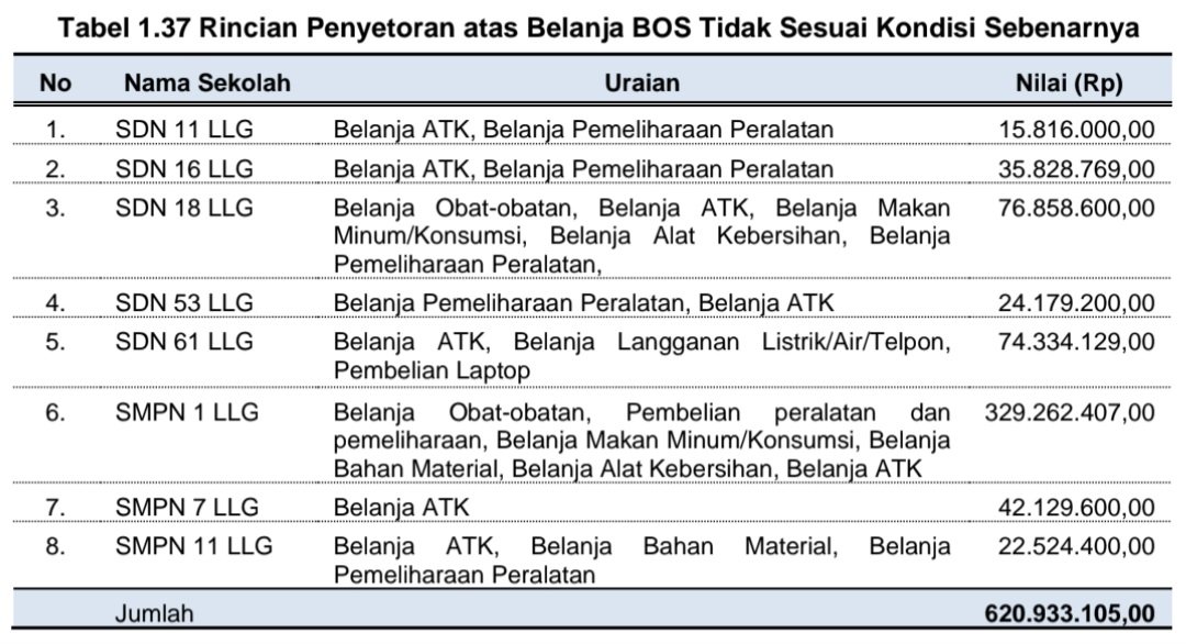 Hasil pemeriksaan atas dokumen pertanggungjawaban Dana BOS dan konfirmasi kepada penyedia barang/jasa menunjukkan bahwa terdapat realisasi Belanja BOS tidak sesuai dengan kondisi sebenarnya sebesar Rp620.933.105,00.