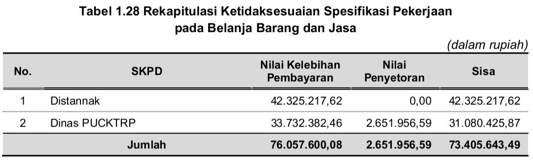 Atas kelebihan pembayaran tersebut telah dilakukan penyetoran sebesar Rp2.651.956,59 sehingga terdapat sisa kelebihan pembayaran atas enam paket pekerjaan pada dua SKPD sebesar Rp73.405.643,49 sesuai tabel berikut.