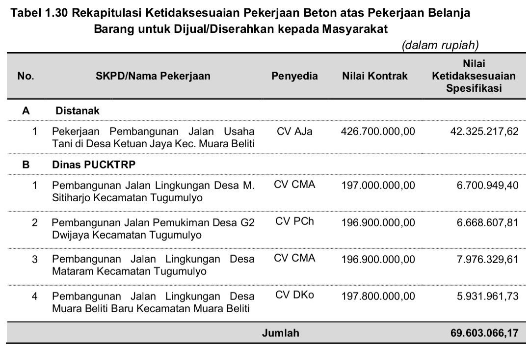 Enam Paket Pekerjaan pada Dua SKPD Pemkab Musi Rawas Tak Sesuai Spesifikasi, Lebih Bayar Harus Setor Kembali ke Kasda