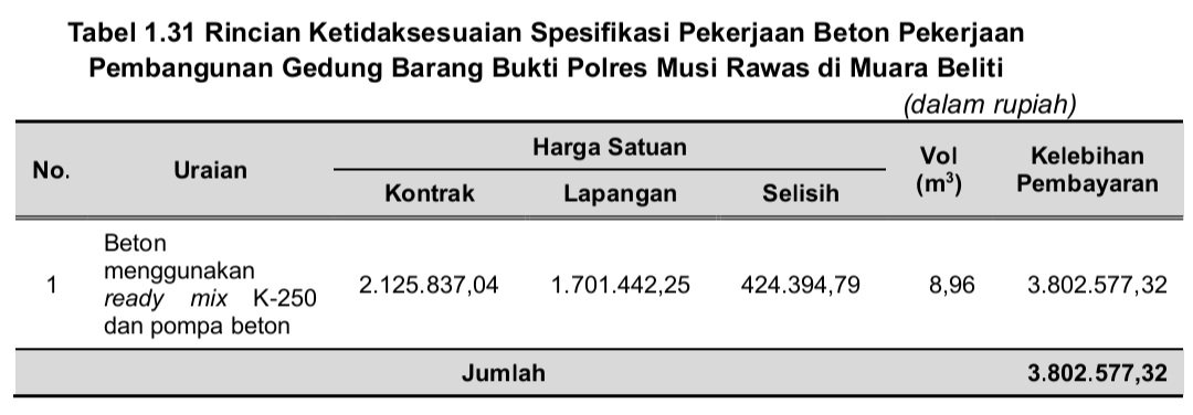 tidak sesuai dengan spesifikasi kontrak sebesar Rp3.802.577,32 atas pekerjaan Pembangunan Gedung Barang Bukti Polres Musi Rawas di Muara Beliti dengan