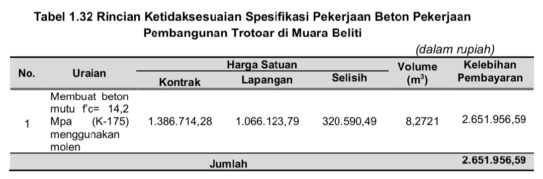 pembayaran atas pekerjaan yang tidak sesuai dengan spesifikasi kontrak sebesar Rp2.651.956,59 atas Pekerjaan Pembangunan Trotoar di Muara Beliti dengan rincian sebagai berikut.