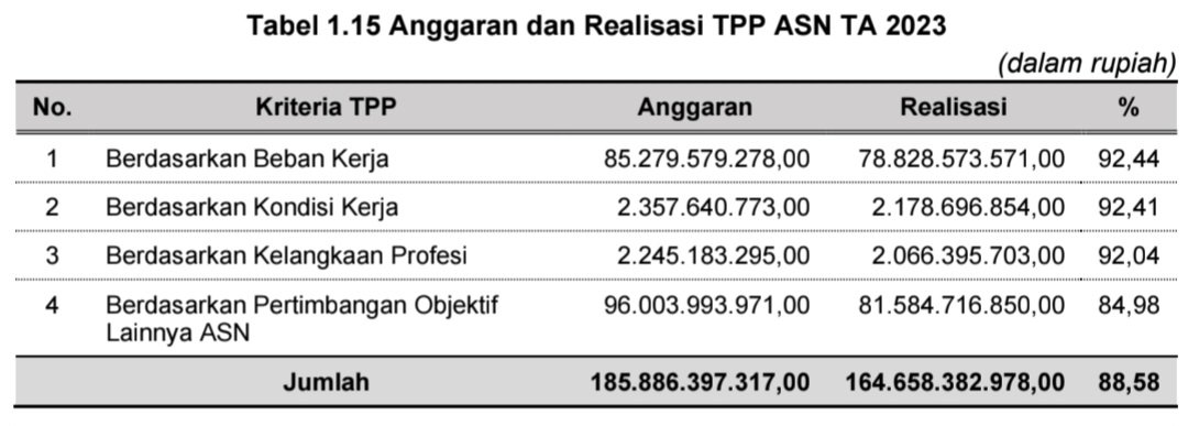 Salah satu realisasi Belanja Pegawai tersebut untuk Belanja Tambahan Penghasilan Pegawai (TPP) Aparatur Sipil Negara (ASN).