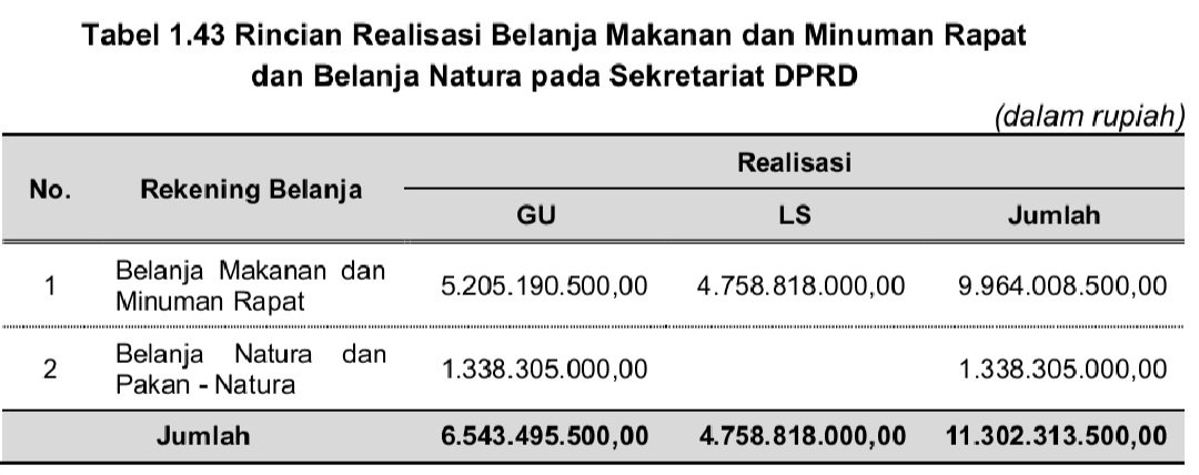 Diantara realisasi tersebut terdapat realisasi Belanja Makanan dan Minuman Rapat serta Belanja Natura dan Pakan-Natura sebesar Rp11.302.313.500,00, dengan rincian sebagai berikut.