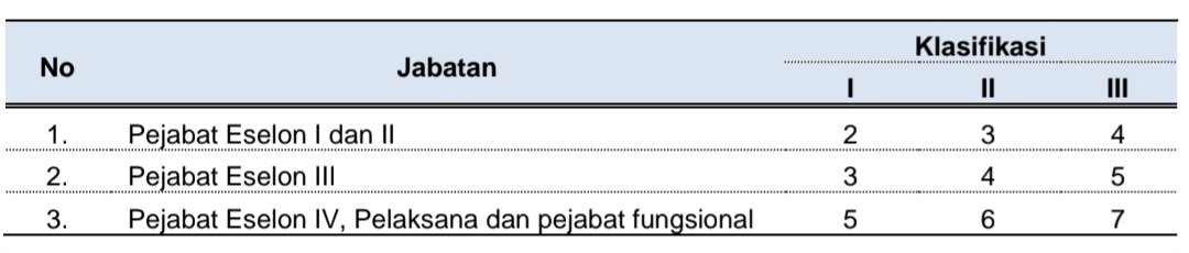 A. Klasifikasi I dengan kriteria pemerintah daerah provinsi, kabupaten ataukota yang telah memberikan tambahan penghasilan pada kelas jabatan tertinggi lebih besar atau sama dengan Rp20.000.000,00 (dua puluh jutaperbulan);