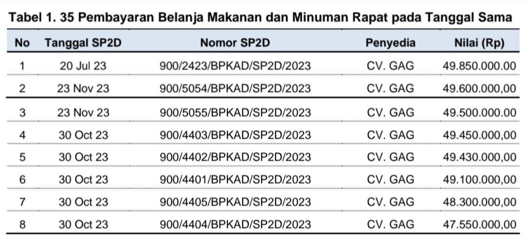 Setiap nilai pengadaan kegiatan makanan dan minuman rapat Sekretariat DPRD tidak melebihi Rp50.000.000,00.