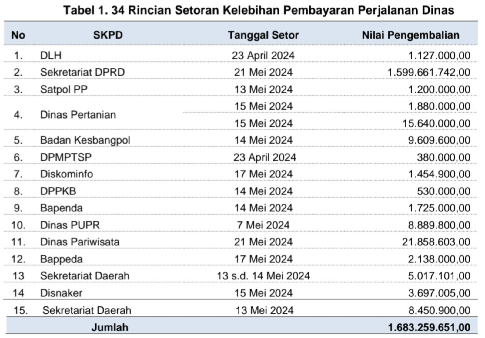 B. Kelebihan pembayaran perjalanan dinas pada 15 SKPD sebesar Rp1.683.259.651,00