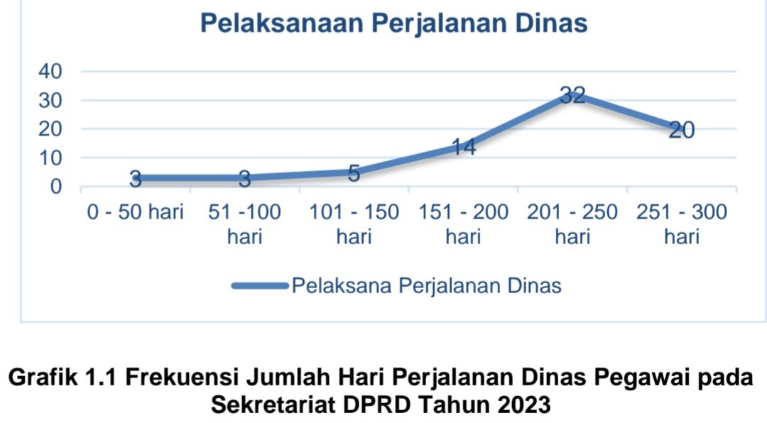 Grafik di atas menunjukkan sebanyak 52 orang melakukan perjalanan dinas > 200 hari, termasuk didalamnya 23 pegawai Sekretariat DPRD dan 29 anggota DPRD.