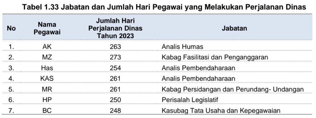 Pegawai dan anggota DPRD pada tahun 2023 melakukan perjalanan dinas sebanyak tiga hingga 88 kali perjalanan selama 14 s.d 288 hari.