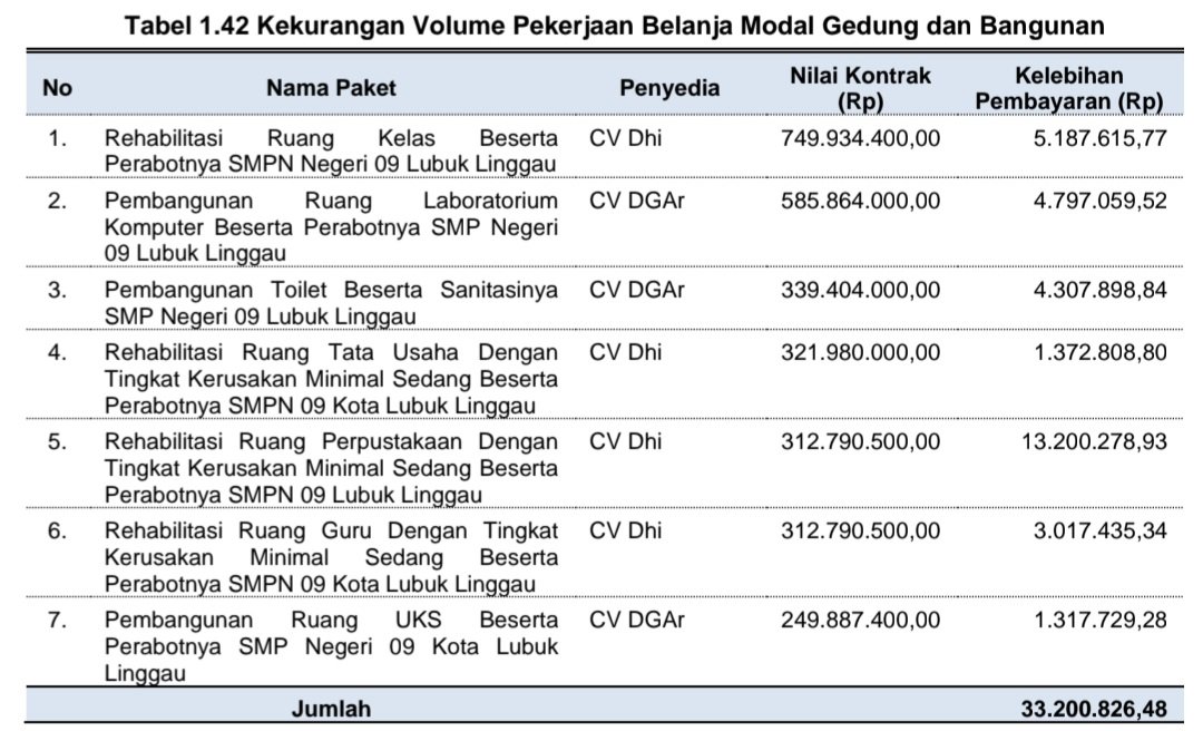Hasil pemeriksaan secara uji petik atas dokumen kontrak dan pemeriksaan fisik pekerjaan kontraktual Belanja Modal Gedung dan Bangunan bersama PPK, Pengawas, Penyedia, dan didampingi oleh Inspektorat Pemkot Lubuk Linggau menunjukkan terdapat kekurangan volume pekerjaan atas sepuluh paket pekerjaan pada Dinas PUPR dan Disdikbud sebesar Rp51.072.125,02.