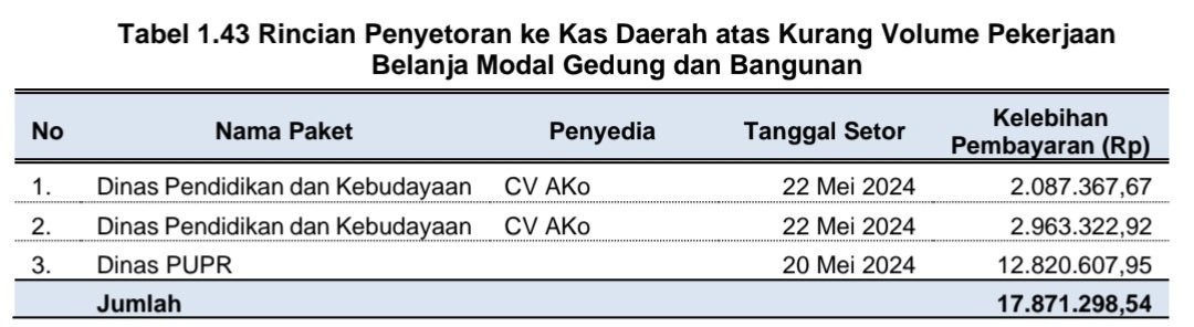 Kemudian, Kekurangan Volume atas sepuluh paket pekerjaan Belanja Modal Gedung Bangunan pada dua SKPD (Dinas PUPR dan Disdikbud) sebesar Rp51.072.125,02.