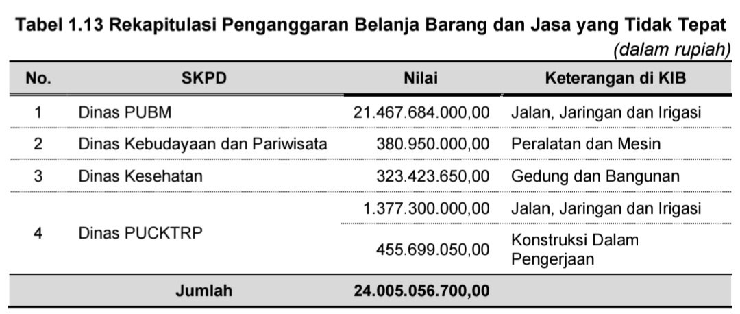 Berdasarkan sifat dan/atau harga satuan per unit diketahui bahwa belanja tersebut tidak tepat dianggarkan dalam Belanja Modal, sehingga substansi belanja tersebut seharusnya dianggarkan pada Belanja Barang dan Jasa.