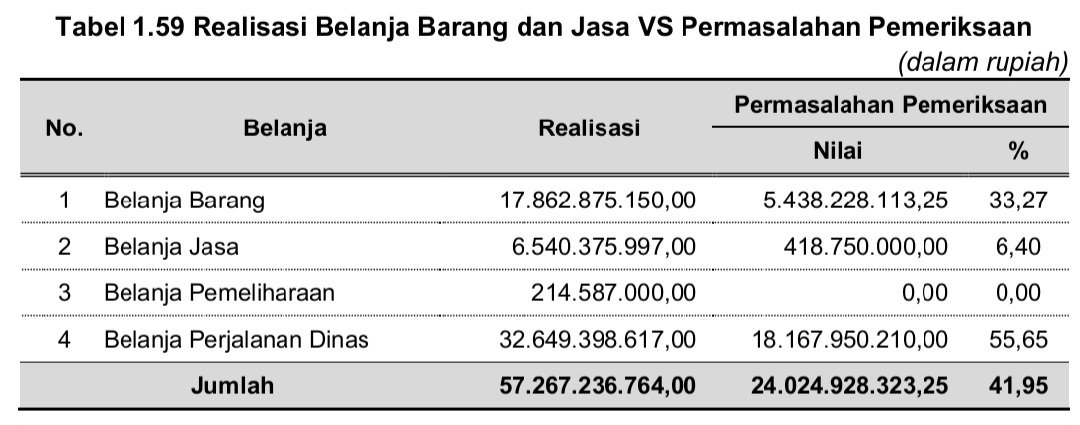 Berdasarkan tabel di atas diketahui bahwa terdapat permasalahan sebesar Rp24.024.928.323,25 atau 41,95% dari nilai realisasi belanja.