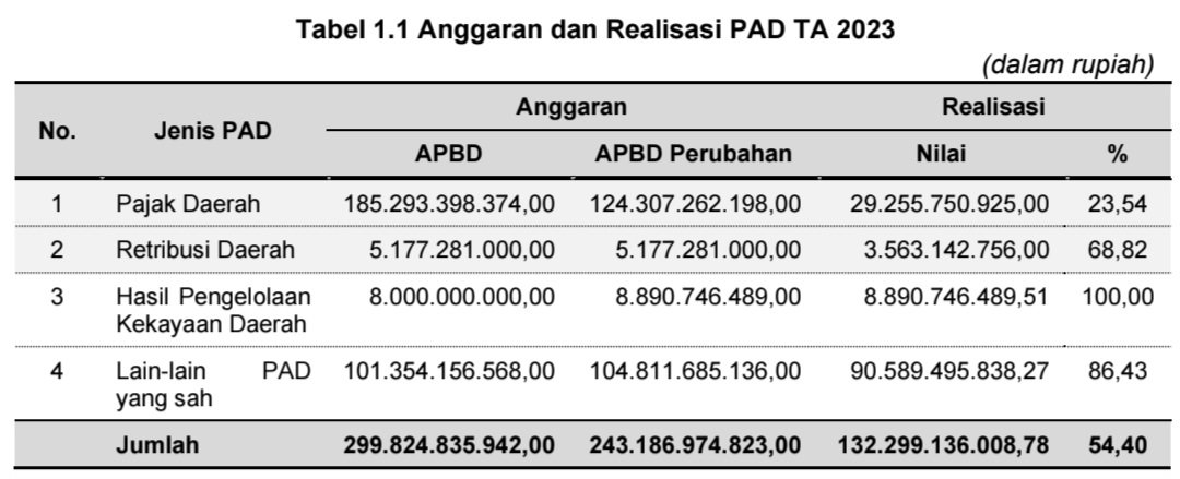 Tabel di atas menunjukkan bahwa anggaran PAD pada Anggaran Pendapatan dan Belanja Daerah (APBD) TA 2023 sebesar Rp299.824.835.942,00.