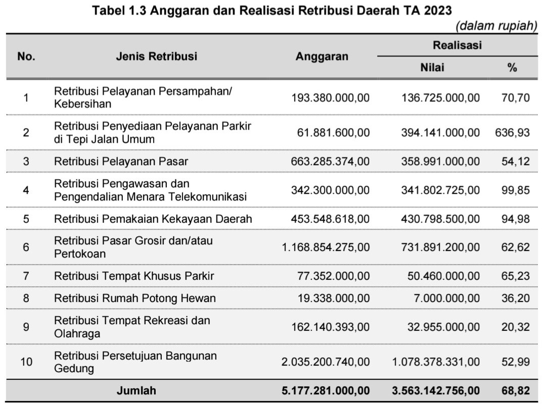 Pemkab Musi Rawas menganggarkan dan merealisasikan Pendapatan Retribusi Daerah pada TA 2023 sebagai berikut.