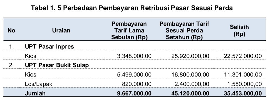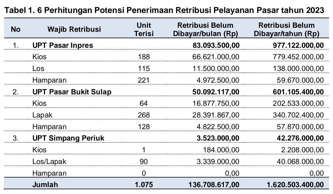 a. Kehilangan potensi penerimaan pendapatan Retribusi Pelayanan Pasar sebesar Rp1.775.311.400,00 yang terdiri dari: