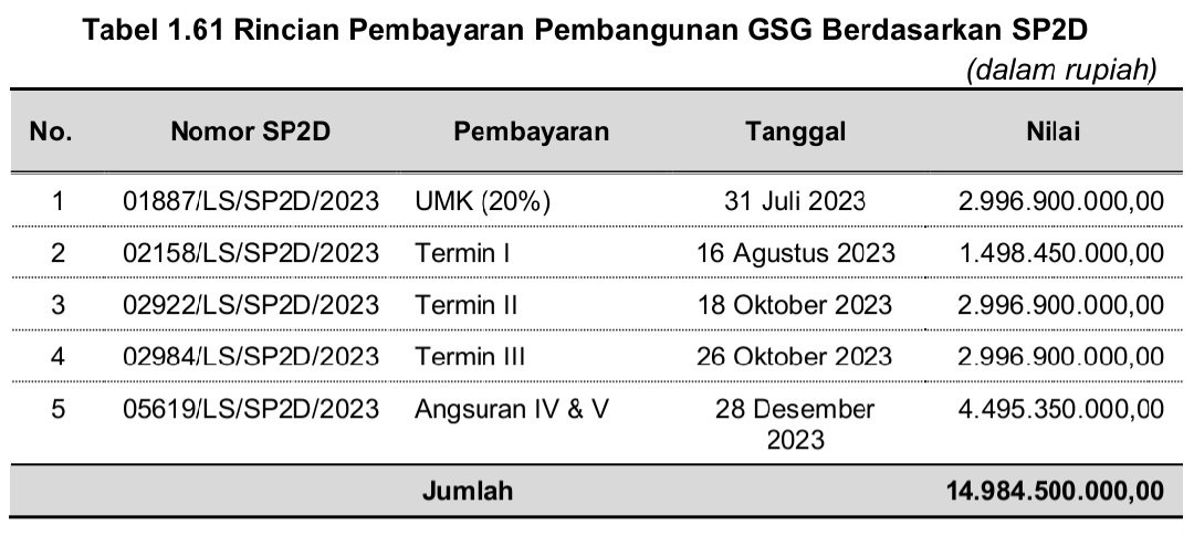 Berdasarkan penelusuran Aset Tetap yang berasal dari Belanja Modal, atas pekerjaan GSG ini telah dicatat sebagai Aset Tetap-Konstruksi Dalam Pengerjaan sebesar Rp14.984.500.000,00.